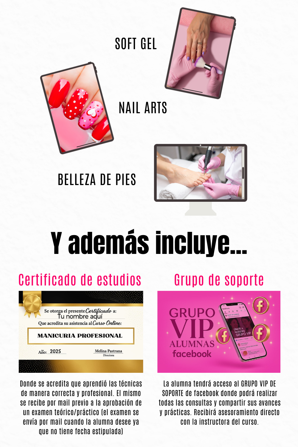 Tendrás acceso al GRUPO VIP DE ALUMNAS EN FACEBOOK, donde podrás hacer consultas y compartir experiencias. Además, recibirás asesoramiento por parte de la instructora de lunes a viernes por tiempo ilimitado vía Instagram.